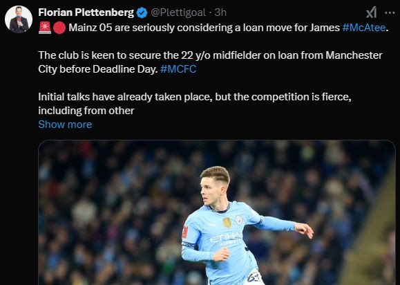 22日,德国著名记者Florian Plettenberg爆料,德甲俱乐部美因茨寻求租借麦卡蒂,已经和曼城取得联系并展开谈判。